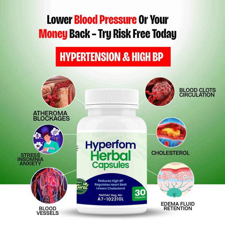 The Hyperfom Herbal Capsules is purely herbal, comes without any side effect and curative for the treatment of hypertension, Stroke, heart failure, to lower blood pressure and many more. And within few days of taking this herbal capsule, you can start seeing improvement in your blood pressure level and your health.